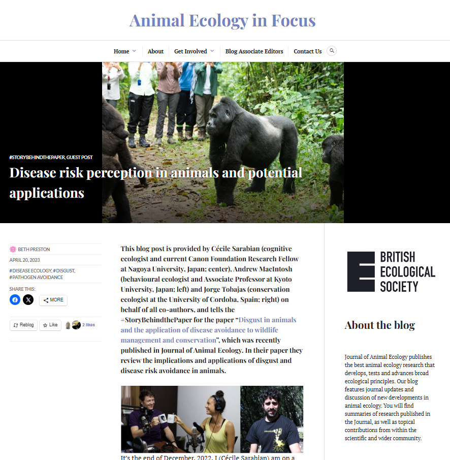 Sarabian, C. (AC), Wilkinson, A., Sigaud, M., Kano, F., Tobajas, J., Darmaillacq, A. S., Kalema-Zikusoka, G., Plotnik, J., MacIntosh, A (2023-in press). Disgut in animals and the application of disease avoidance to wildlife management and conservation. Journal of Animal Ecology, 92, 1489–1508. https://doi.org/10.1111/1365-2656.13903
