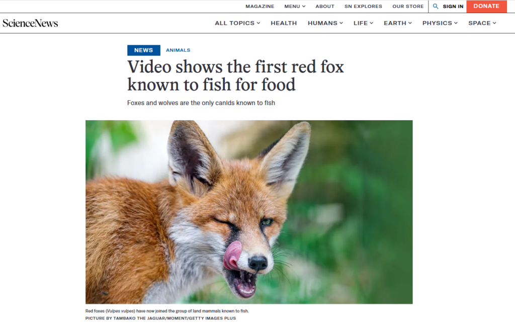 Science News Explores: https://www.snexplores.org/article/red-fox-fishing-for-food-first-video-spain